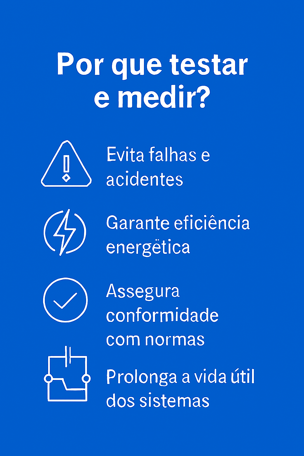 Imagine que a eletricidade é como um rio que flui por fios e cabos. Testes e medições elétricas são como instrumentos que nos permitem analisar esse fluxo, verificando se ele está dentro dos parâmetros seguros e se todos os componentes