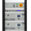 A alimentação do gabinete é feita por painel de rede, com conectores industriais multipolares para até 32 A. Há uma saída fusível de 25 A integrada ao circuito de emergência para alimentar fontes externas.