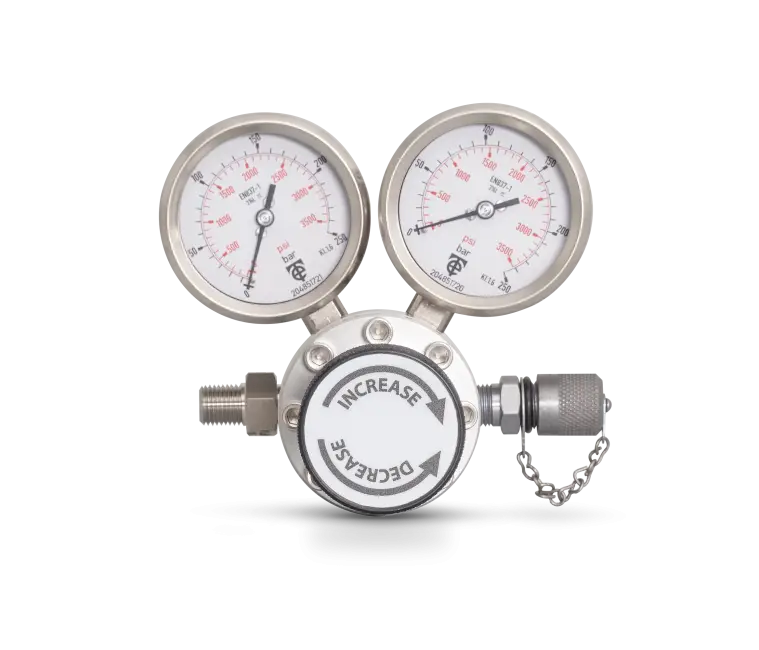 - O regulador tem 2 manômetros analógicos (63 mm, classe 1.6) para exibir a pressão de entrada e saída. Ambos os manômetros são para uso até 250 bar (3500 psi).