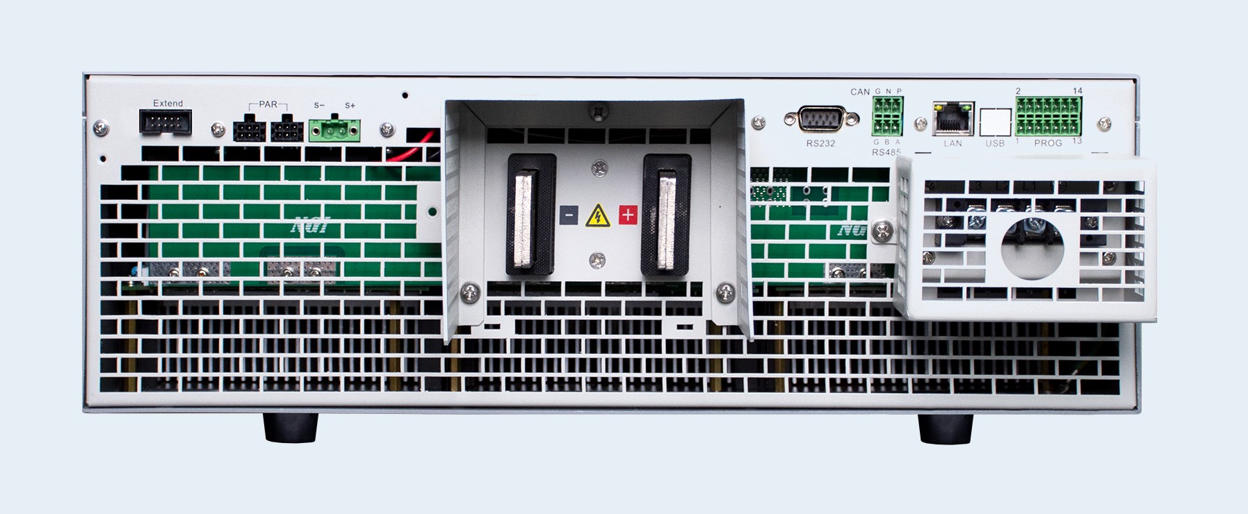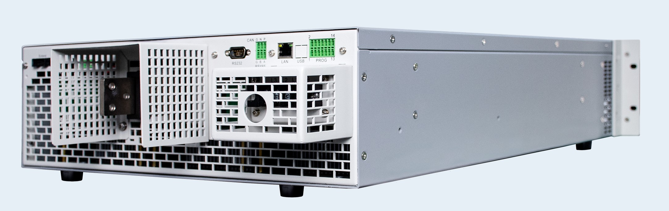 A interface de controle inclui display digital, entradas analógicas e digitais, além de suporte para protocolos como SCPI, Modbus e CANopen. A arquitetura modular permite configurações personalizadas para atender a requisitos específicos de teste.