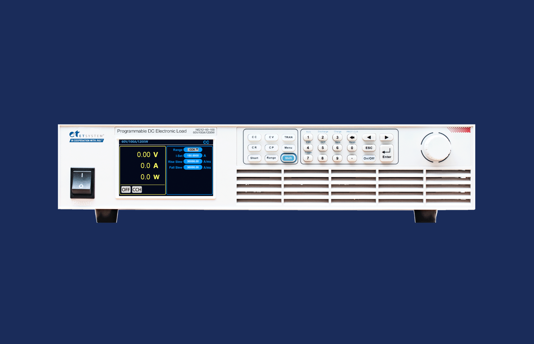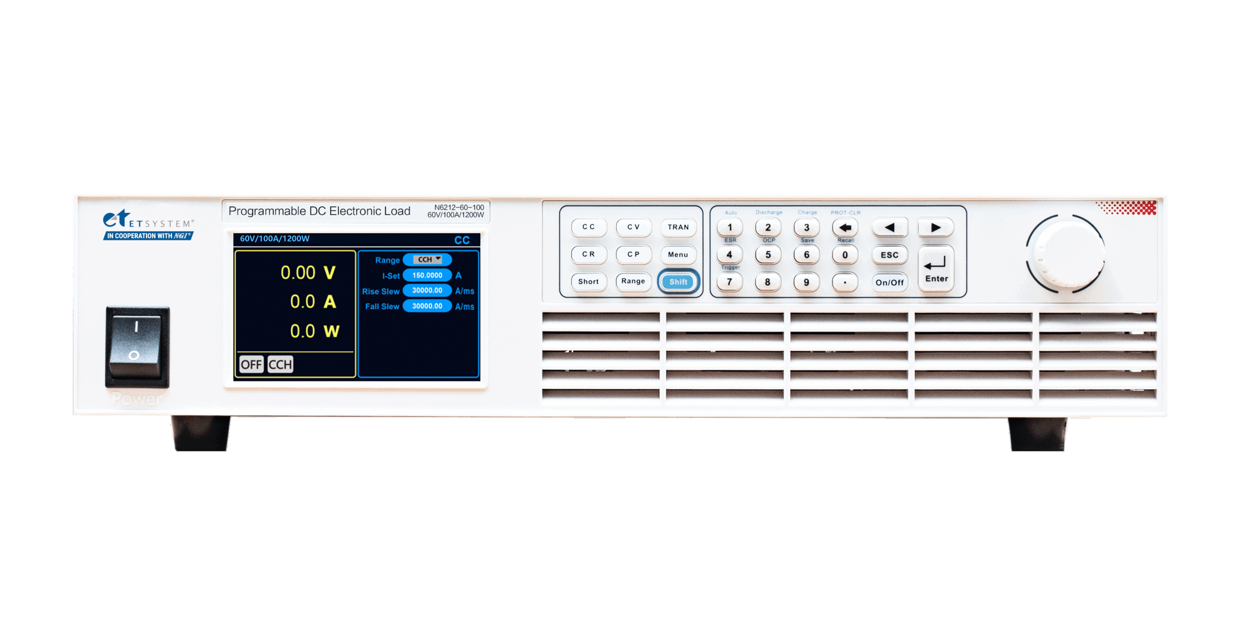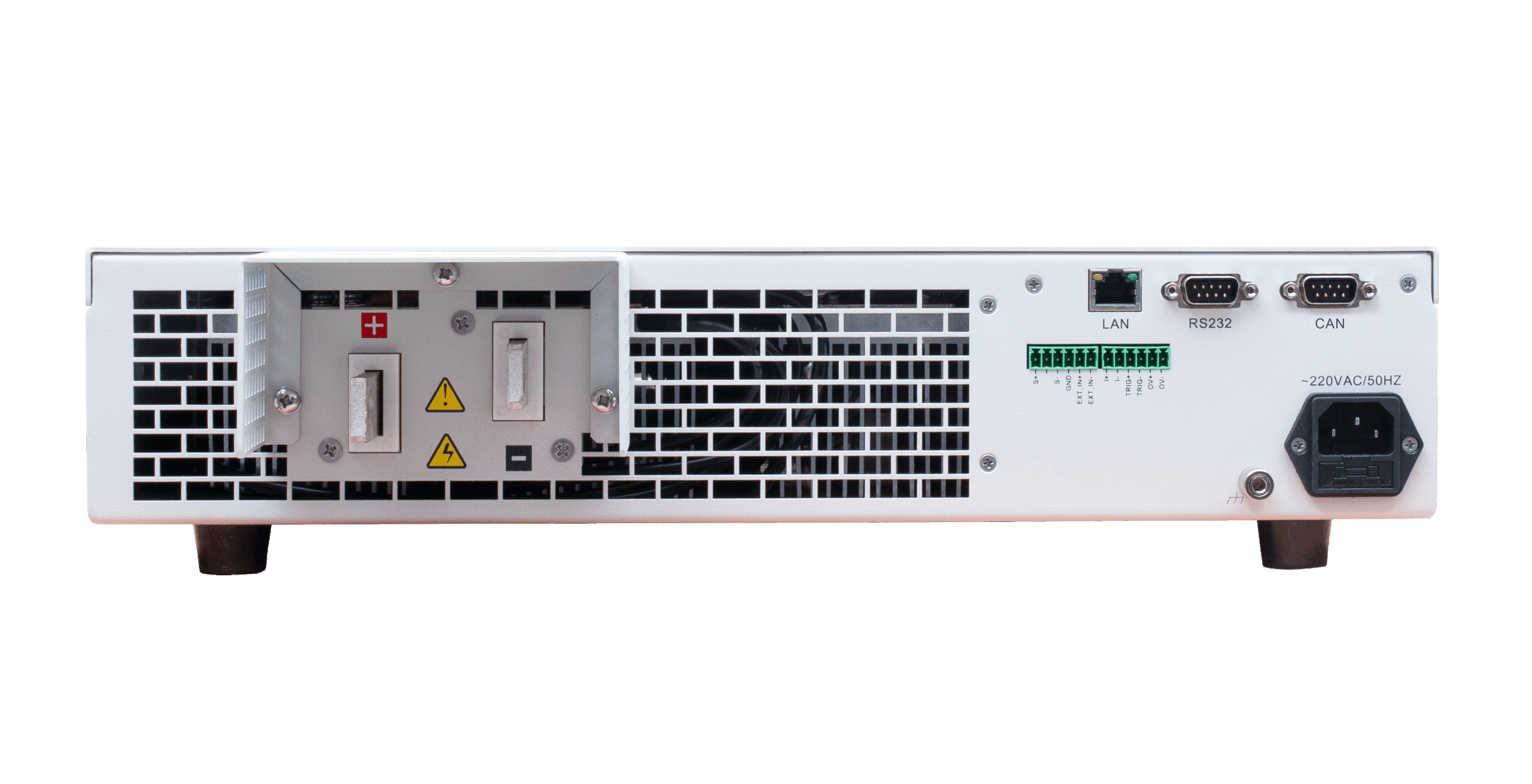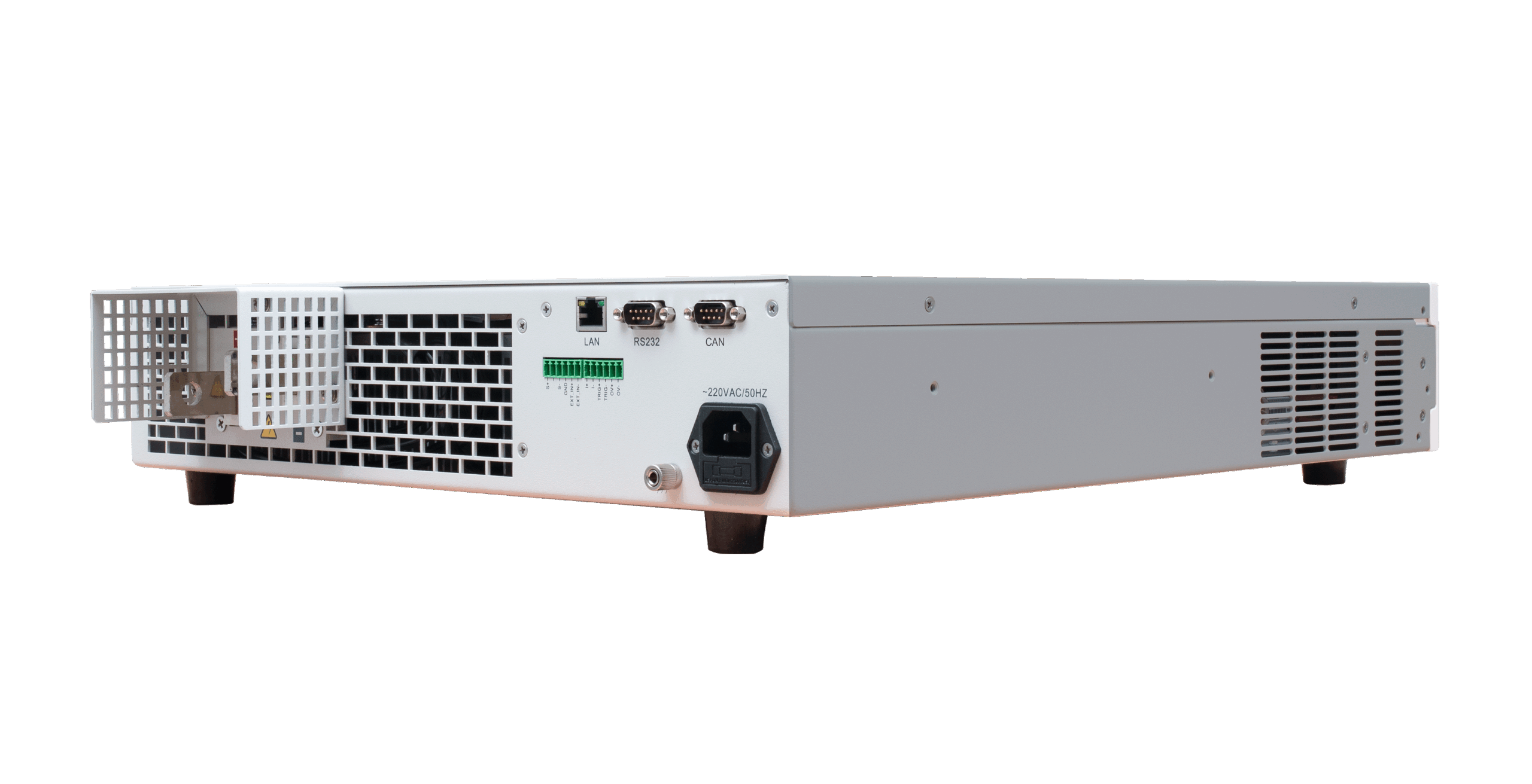 Dispõe de interface de controle remoto via LAN, RS-232, CAN, leitura local via painel frontal, e permite ajuste de taxa de subida/queda (slew rate) para acomodar diferentes cargas e velocidades de resposta.