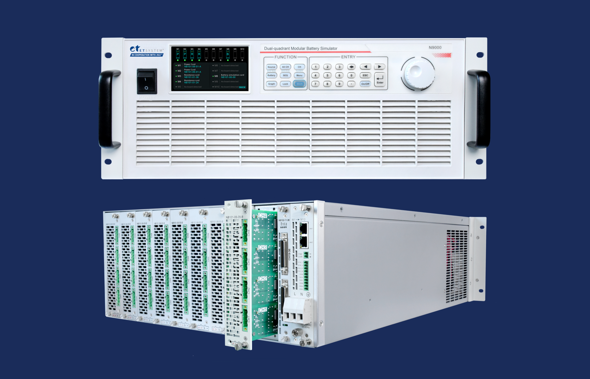 O sistema utiliza um chassi padrão 4U em formato 19″, com até 10 slots de módulo intercambiáveis (ex: módulo de simulação de célula, módulo de falha, módulo de temperatura, módulo de fonte-alta tensão) totalmente isolados eletricamente.